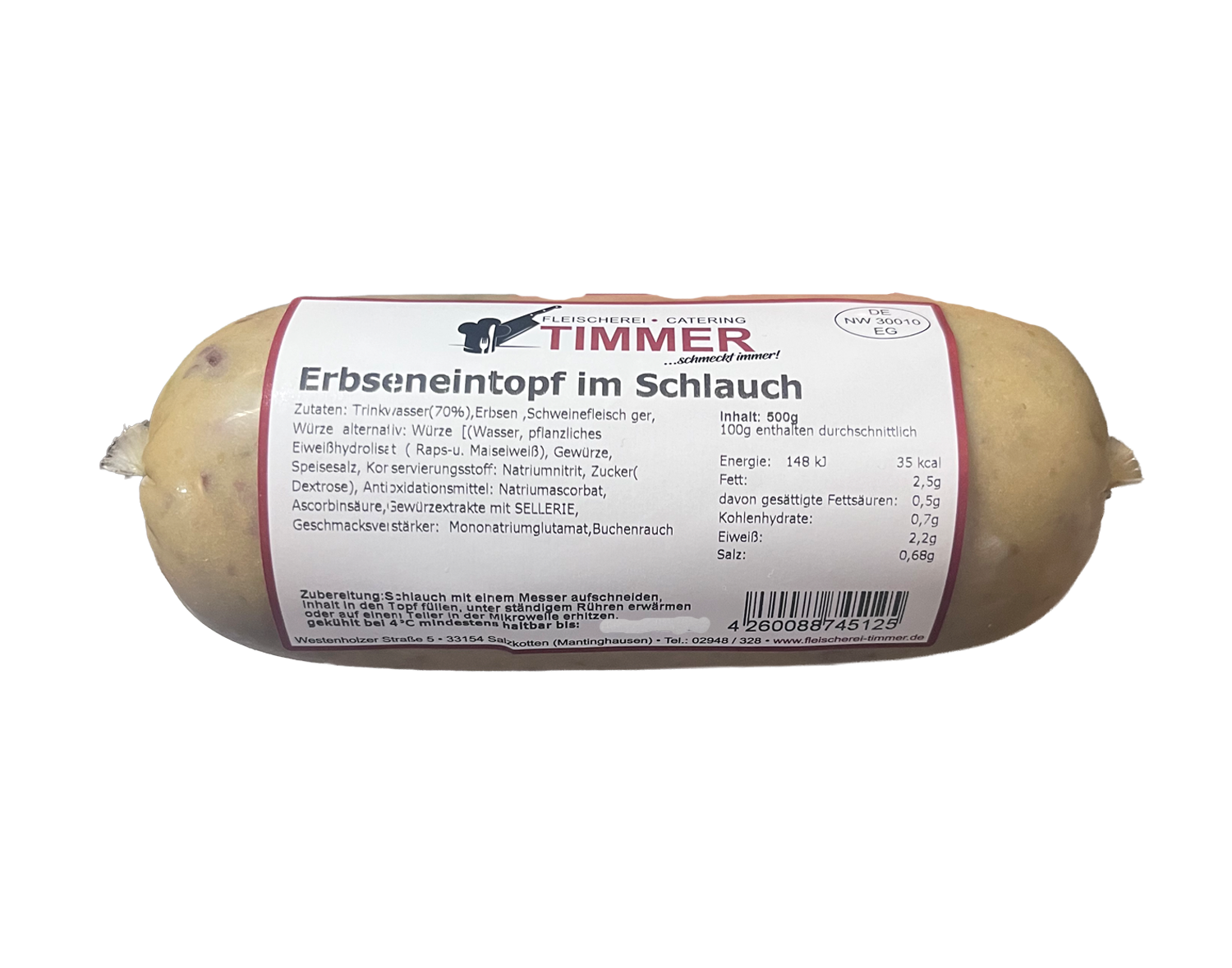 Erbseneintopf im Schlauch – herzhafte Suppe mit Erbsen, Gemüse und feinen Gewürzen in einem praktischen Schlauchbeutel. Ideal als schnelle Mahlzeit unterwegs oder portionsweise aufzubewahren. Einfach erwärmen und genießen.