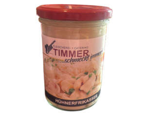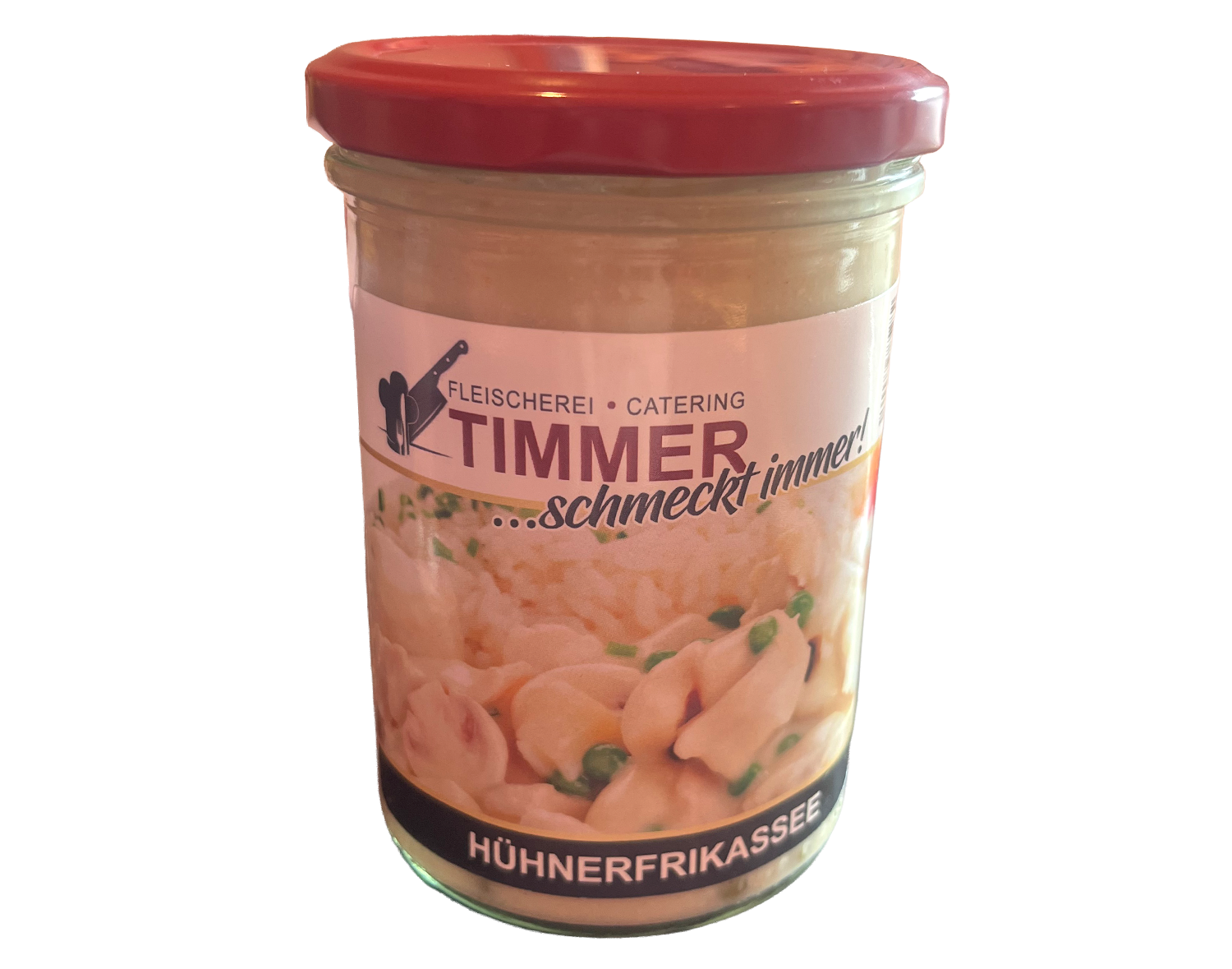 Hühnerfrikassee im Glas – zartes Hühnchen in cremiger Soße mit Gemüse, verpackt im Glas für frische, praktische Aufbewahrung. Ideal als schnelle Mahlzeit, einfach erwärmen und genießen.