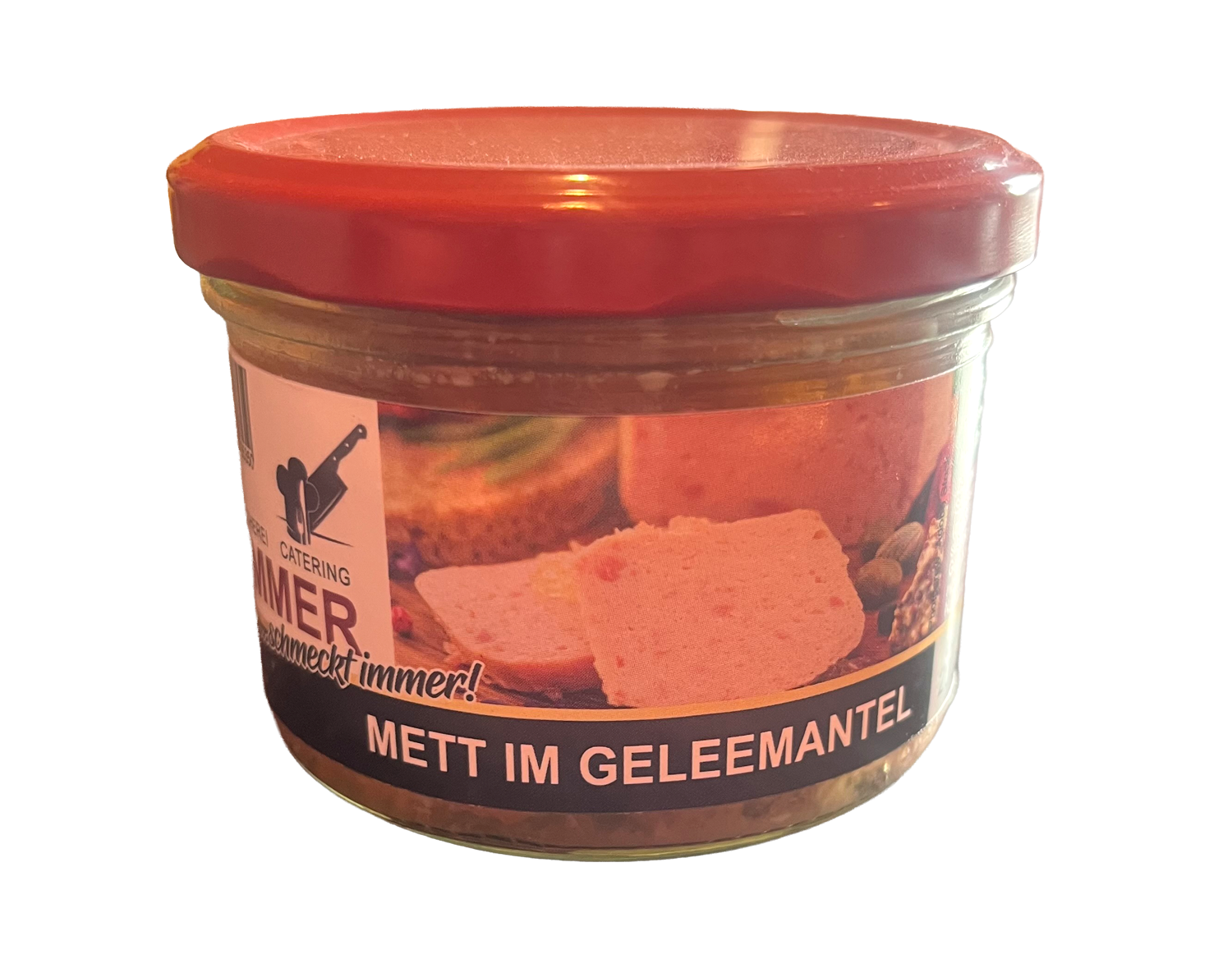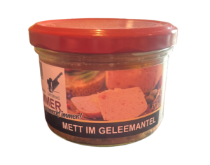 Von einem feinen Geleemantel umhüllt zeichnet sich unser Mett durch eine milde, frische Würze aus. Das Mett wird aus reinem Schweinefleisch hergestellt und mit einer naturbelassenen Gewürzmischung abgeschmeckt. Die Aufgeschnittene Mettwurst im Gelee ist ein würziger Brotbelag, der besonders gut zu frischem Bauernbrot schmeckt.