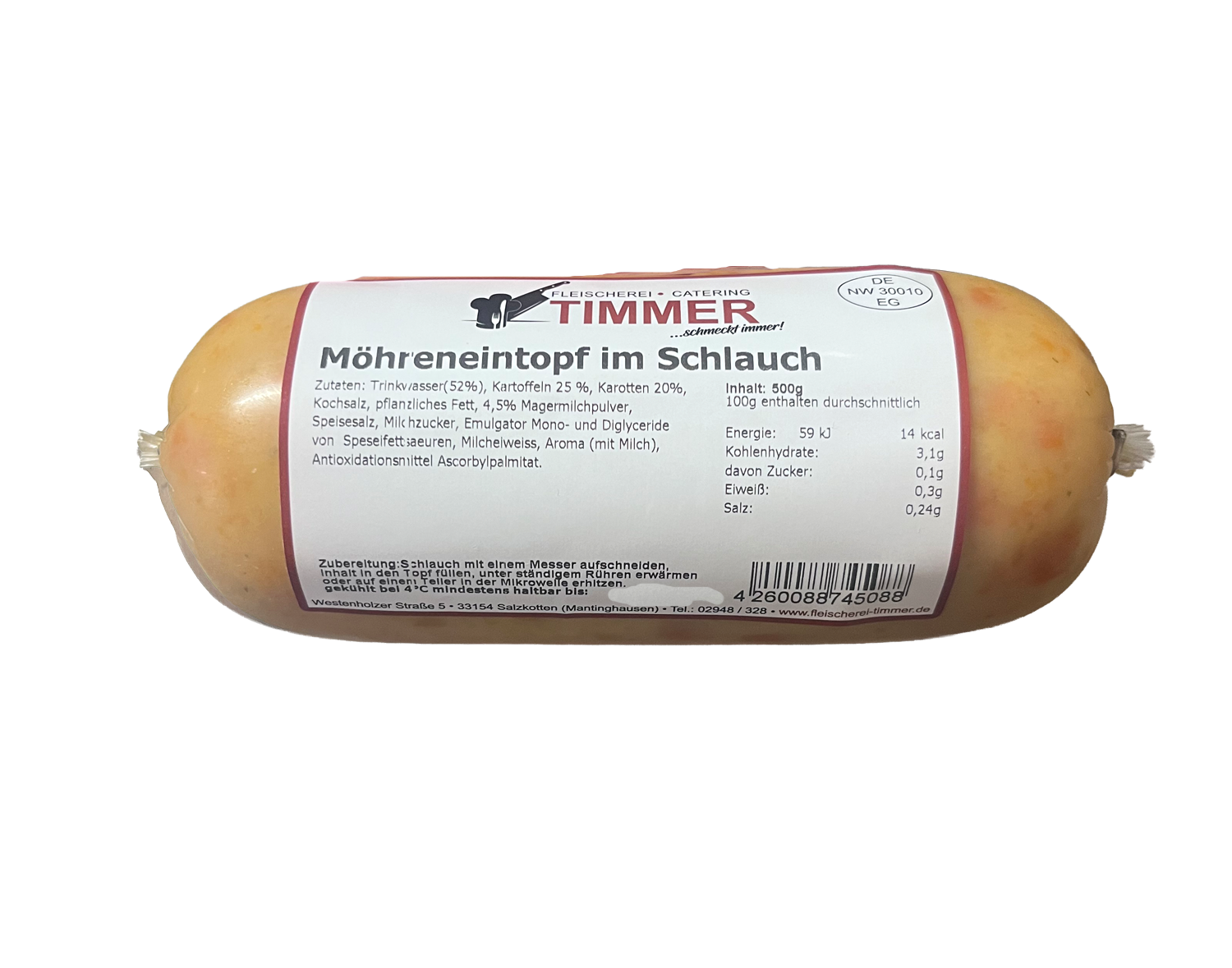 Möhreneintopf im Schlauch – herzhafte Suppe mit Möhren, Kartoffeln und bunten Gewürzen in einem praktischen Schlauchbeutel. Ideal als schnelle Mahlzeit unterwegs oder portionsweise aufzubewahren. Einfach erwärmen und genießen.